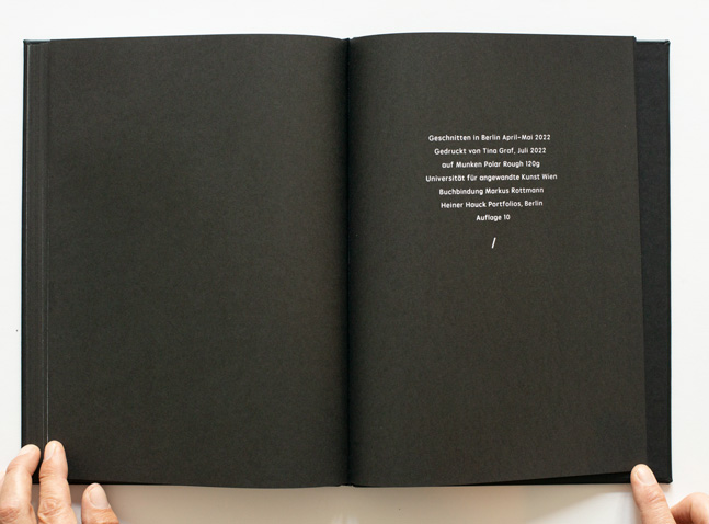 an artist's book with 12 images cut in linoleum and 12 uncut images + endpapers all printed from linoleum. Title page and impressum page printed from cliches. Japanese binding, full leather. Paper: Munken Polar Rough 120 g. Cut in Berlin April-May 2022. Printed by Tina Graf in Vienna, July 2022. Bound by Markus Rottmann at Heiner Hauck Portfolios in Berlin, August 2022. Edition 10+2.