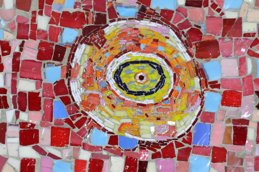 one of several installation views of the wall, 3 x 15 meters, made for the canteen in the new building of the school (pupils up to the age of 12). It was opened in August 2018. The wall is made of glazed and unglazed acoustic brick; mosaics (see details of separate mosaics) which repeat and play on the hole patterns of the bricks as well as ceramic elements (see details of separate ceramic plates), which also mimic the bricks, although without their holes. The construction/installation of the wall took place in February 2018, by bricklayer Dan Ahlgren, assisted by JS. The mosaic elements were made by cosmomusivo in Berlin, from JS' watercolor sketches. The ceramics were made by JS at the University for Applied Art Vienna. The title "Mitt i prick" is ambiguous to translate. It could mean "Dot in the middle", but also "Right on Target".