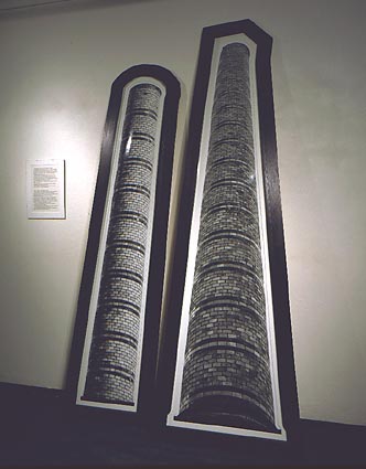 TEST-paintings at Galerie Anhava, also in Helsinki. On the lower main floor at Hippolyte was installed a series of colour photographs representing the different stages of construction for the Taejon chimney. At the entrance were two large chimney photoobjects leaning against the wall (left: "Torn 2" 240,5 x 62,5 cm, 1990, right: "Torn 7" 264 x 89,5 cm, 1991), beside a short presentation text in