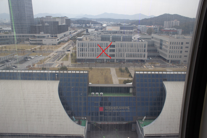 the X marks the approximate location where "The Second Chimney" was built. The present building, from around 2015, is a scientific research facility. The photo was taken from the "Tower of Great Light" on November 5, 2023.
