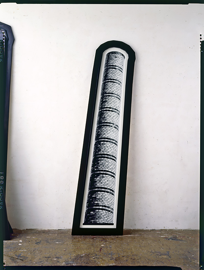 photo-object, 240,5 x 62,5 cm, 1990. One of eighth very large "towers" made in 1990-1991, here photographed 1992 in the studio with the new 4x5" camera.