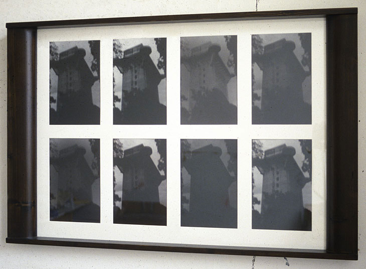 Photo-object, 68x107x5 cm. The first photo-object. One negative was printed slightly differently eight times and placed in carefully made frame (by JS). The photograph was exposed just before closing time in Vienna's Augarten on Sunday 14.9.1986. Please note that it's the reproduction of the object, which was shot at an angle...