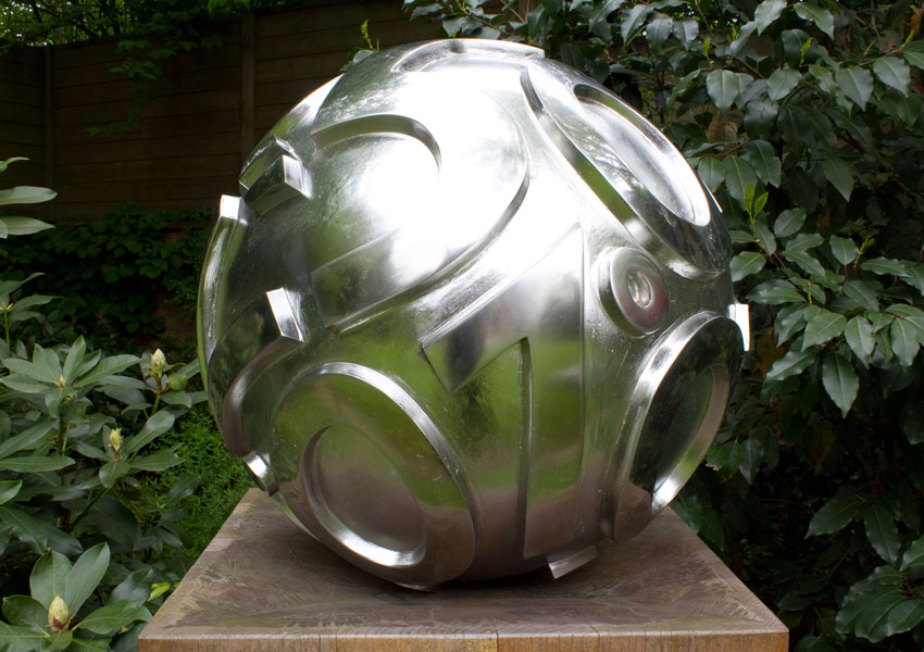 Commissioned sculpture for a private collector in Cologne (one of four images). The sphere is made of cast stainless steel, diameter ca 55 cm. The plinth is made of solid acacia wood, dimensions 50x50x110 cm. The relief on the sphere depicts the exact longitude and latitude of the sculpture's location, with a margin of error of +/- 10 meters. The actual title of the work is "Zentrum der Welt" (Centre of the Earth) followed by the street address of the location. Due to privacy concerns, the second part of the title has been left out here.