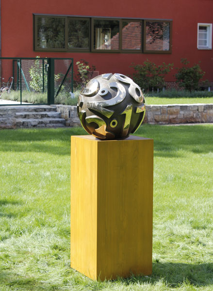 Commissioned sculpture for a private collector in Berlin (one of four images). The sphere is cast in bronze, alterantively patinated and highly polished, diameter ca 55 cm. The plinth is made of solid acacia wood, dimensions 50x50x110 cm. The relief on the sphere depicts the exact longitude and latitude of the sculptures location, with a margin of error of +/- 10 meters. The actual title of the work is "Zentrum der Welt" (Centre of the Earth) followed by the street address of the location. Due to privacy concerns, the second part of the title has been left out here.