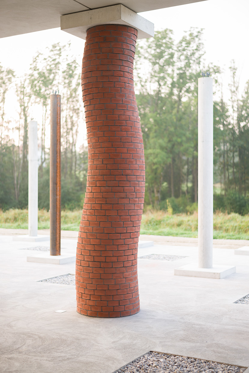a series of photos of a "twisted" chimney column in the STOA169 hall, on a field near Polling, Germany. The column was built together with bricklayer Pascal Marturella 24-29 August, 2020. The first 81 columns of the 121 in preparation, were inaugurated on September 13, 2020. These photos were made early on that same morning.