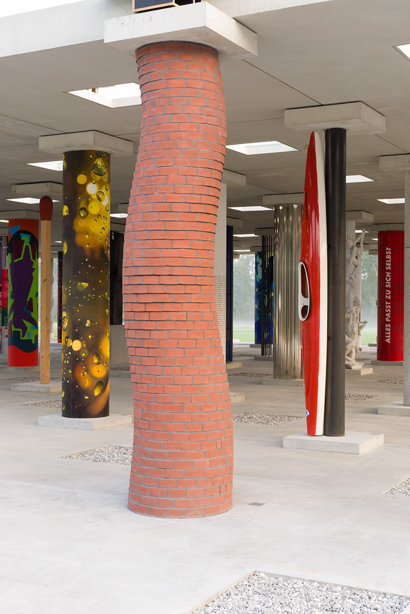 a series of photos of a "twisted" chimney column in the STOA169 hall, on a field near Polling, Germany. The column was built together with bricklayer Pascal Marturella 24-29 August, 2020.