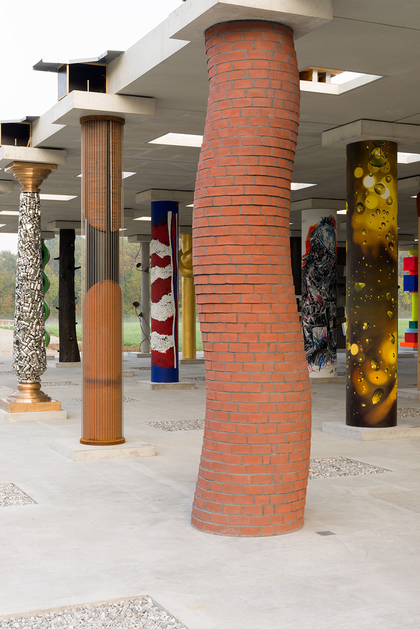a series of photos of a "twisted" chimney column in the STOA169 hall, on a field near Polling, Germany. To the left, in line: Justine Gaga. The column was built together with bricklayer Pascal Marturella 24-29 August, 2020. The first 81 columns of the 121 in preparation, were inaugurated on September 13, 2020. These photos were made early on that same morning.