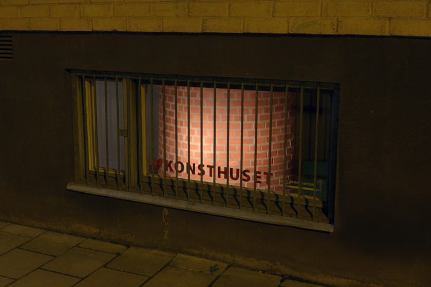 One of 10 installation views from the November 2012 exhibition at Konsthuset Uppsala Konsthall. Closeup view from outside, at night.