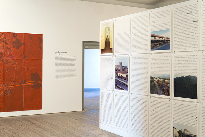 Installation view (the "Hebdomeros room") from the retrospective exhibition curated by Johanna Uddén, at Uppsala Art Museum, February 9 – April 23, 2017. Please note that in this photo the painting "A Place on Earth" at the left, is still installed upside down...