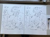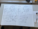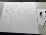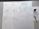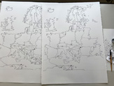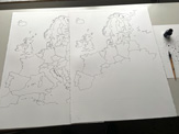 After today I have three more drawings to go. Then I will photograph all of them and process the photographs so that all greyscales disappear and leave only black line and surface on zero colour white. After which I will add a colour (in photoshop) to each country of the EU, beginning with the first sheet. This is the fun part: you slowly see the actual story being revealed. Finally, I will deliver the files to be printed out, in scale 1:1. If the printing company is working.