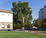 During work on my upcoming big show I realized I still did not have a perfectly realized photo of the Frankfurt chimney: "First Chimney II". Soon after it was finished, in 2013, I had travelled down, again, from Berlin and spent a day photographing it very carefully with my (analog) large format camera. Then the lab damaged all the negatives in development. It was so off putting and made me loose interest in a new attempt. But now I realized I had the time, and the weather was going to be great and therefore I took the Sprinter from Berlin Hbf on a Wednesday morning at six and was hard at work – with my analog large format camera – in perfect conditions, at the Städel only four hours later. And the sky was blue, the chimney looked new. One thing about these projects is that they have a great potential for ageing: the chimneys just look better and better as the years pass and the absurdity of their existence doesn't lessen. On the contrary! The photo here is a digital snapshot: the negatives have just been developed and haven't been scanned yet. Wait and see – and read the text, in the meantime.