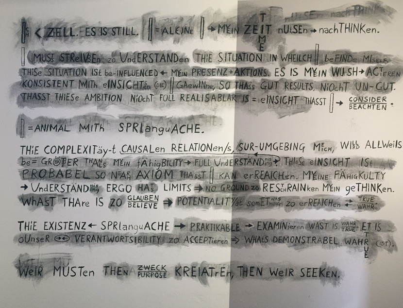 Iphone-photo montage of wall drawing, titled "Credo", for "Luther and the Avantgarde" in Wittenberg Old Prison (photographed 18.05.2017).