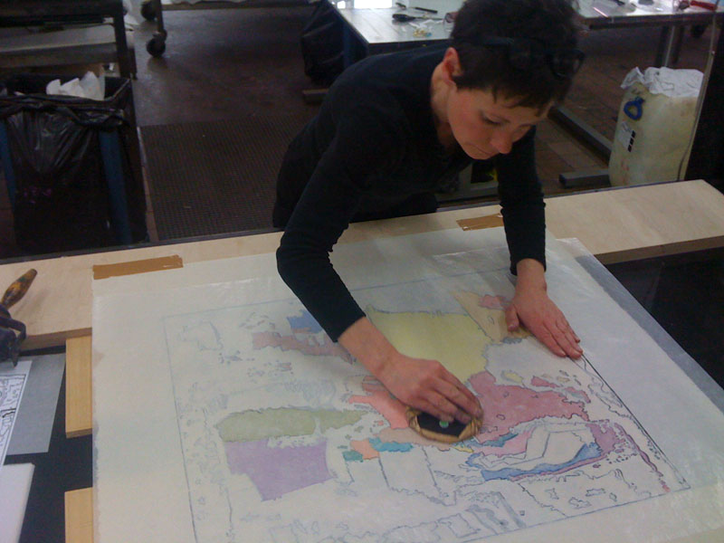 Proofing "Psycho-Mapping Europe 21" at Niels Borch Jensen's in Copenhagen. Julie Dam handprinting.