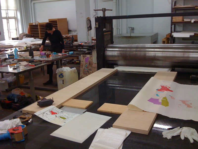 Proofing "Psycho-Mapping Europe 21" at Niels Borch Jensen's in Copenhagen. Julie Dam rolling a colour on one of the blocks.