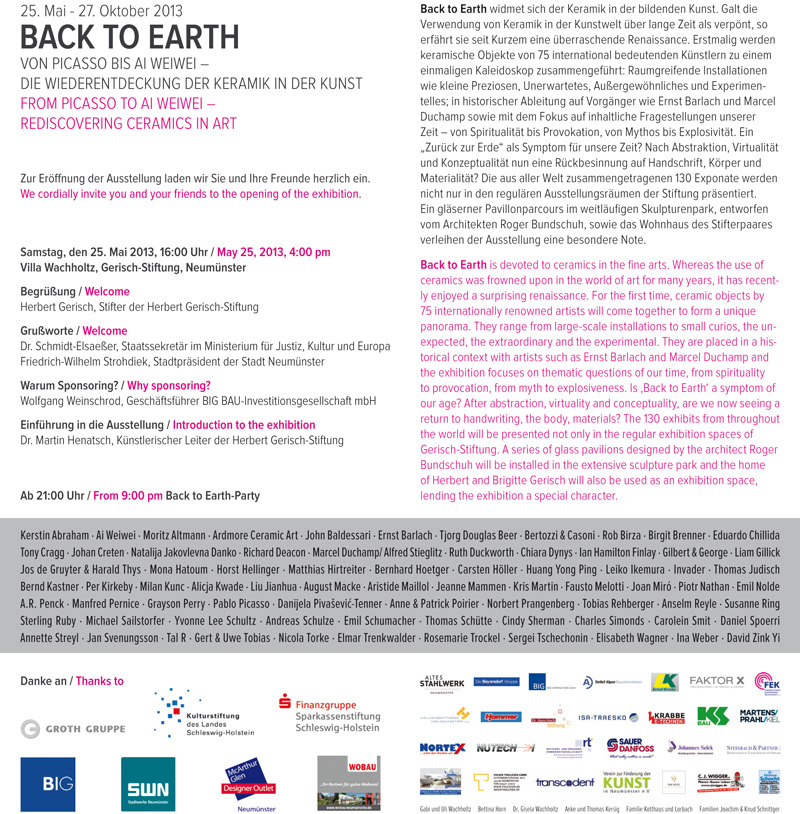 Invitation card "Back to Earth", Gerisch Stiftung, Neumünster, opening May 25, 2013.